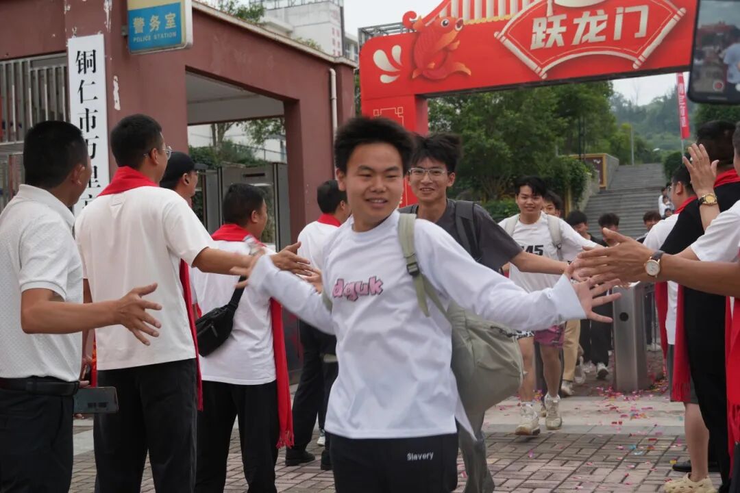 6月6日上午9点,在思南县万里中学校门口,接送考生的车队已准备就绪,428名高三考生精神抖擞,在民警和老师的引导下,井然有序地排队出校门、上车。现场,全校老师与参加高考的考生一一击掌鼓劲,还有不少高一、高二的学弟学妹们为参加高考的考生齐声呐喊,希望他们都能“金榜题名”。
