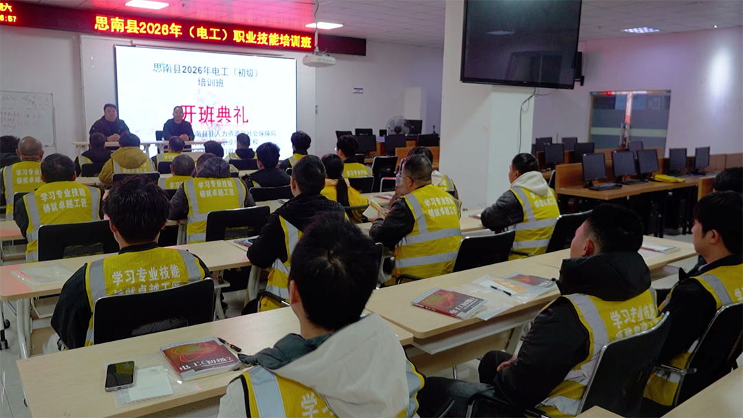 “不用出远门,不用花一分钱,在家门口就能学电工技能,还能考证书、找工作,这样的好事真是太实在了!”近日,思南县2026年电工职业技能培训班在经开区电商产业园公共服务中心开班,全县50余名待业群众、农村剩余劳动力齐聚一堂,开启为期30天的技能提升之旅,来自塘头镇的参训学员张贵成难掩激动,话语里满是对培训的期待。