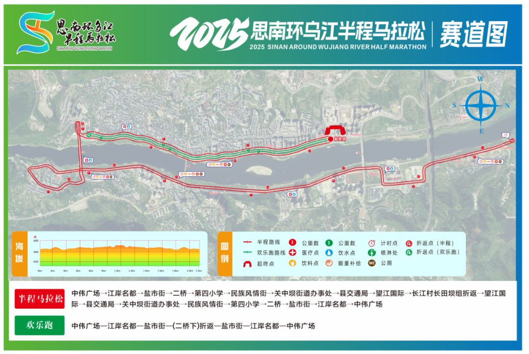 (一)半程马拉松:中伟广场(起点)—江岸名都—盐市街—二桥—第四小学—民族风情街—关中坝街道办事处—县交通运输局—长江村长田坝组处(折返)—县交通运输局—关中坝街道办事处—民族风情街—第四小学—盐市街—江岸名都—中伟广场(终点)全程21.0975公里;