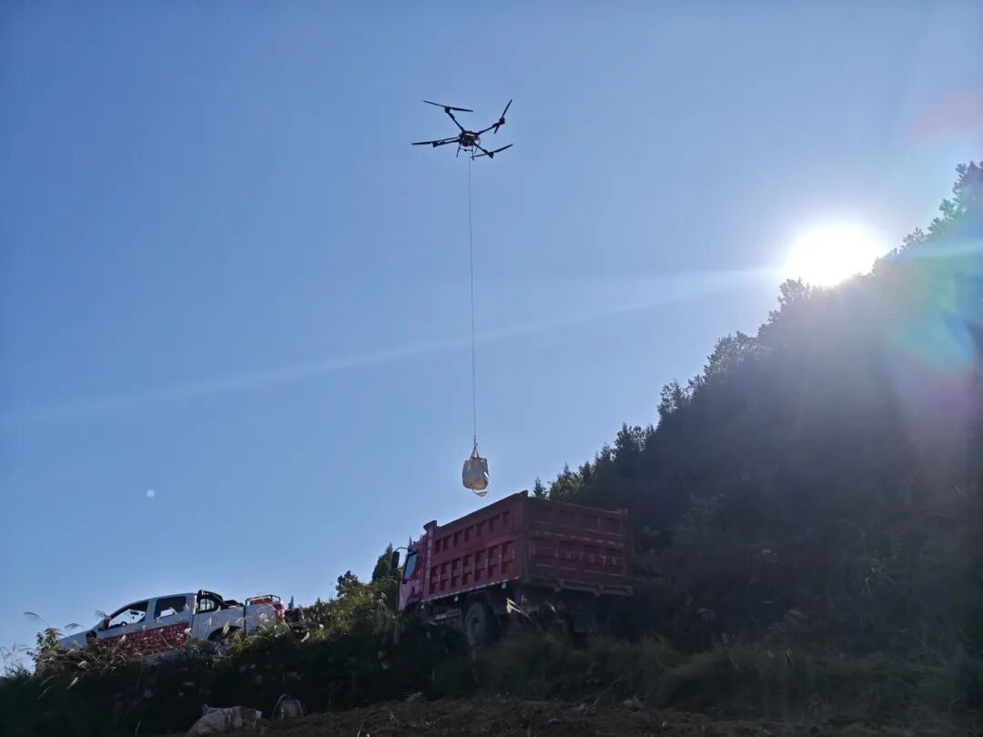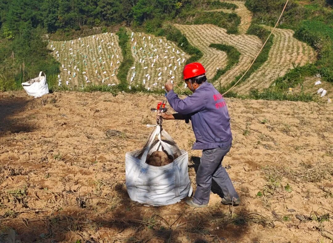 在尖峰村的红薯种植基地,最引人注目的莫过于低空掠过的无人机。与传统农业“面朝黄土背朝天”的模式不同,这里早已用上了“高科技”。无人机不仅用于精准施肥、高效喷药,还能通过搭载的多光谱相机监测作物生长情况,实现病虫害早发现、早防治。“利用无人机把红薯吊运到大货车上,替代传统人工搬运模式,省时又省力。”技术人员介绍道。