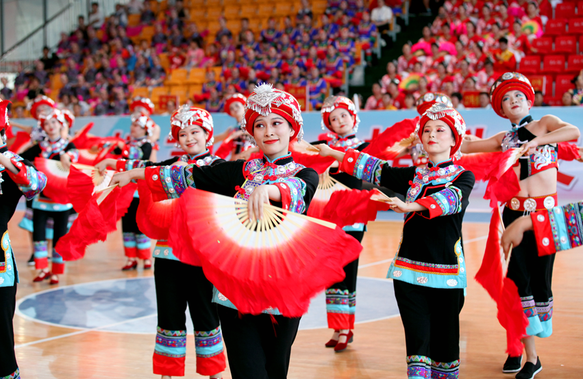 全县40支队、县职校非遗展示队在县三中体育场进行万人花灯、万人摆手舞展示,现场万人托举红旗、万人歌唱《我和我的祖国》。各市(州)花灯团队观众席观看。