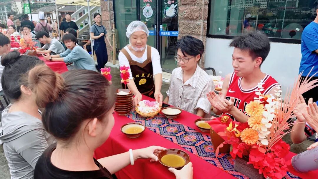 此次“花烛喜宴”长桌宴精心打造13道特色菜品,每一道都承载着当地风味记忆。粉蒸喜扣肉肥而不腻,凝聚土家待客热忱;乌江辣子汤鲜辣爽口,尽显乌江食材本味;南瓜饺饺酥造型精巧,呼应花烛文化中的喜庆意象。这些菜品既有“山水素锦囊”等创意素食,也有“米花米线”等传统甜点,构成了兼具口感与文化内涵的“花宴”体系。“不仅吃到了乌江的鲜,还看懂了花烛的美,这趟国庆之旅太值了!”来自重庆的游客王女士举起手机记录烛影佳肴,难掩兴奋。