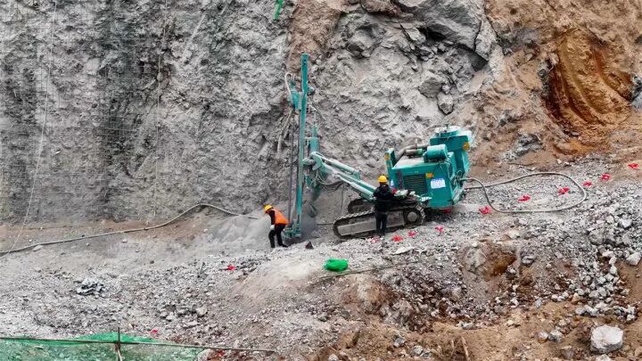 “目前项目部人员到岗管理人员49人,作业工人到岗217人,现有57台机械设备正全力进入抢工状态。花滩子三通一平及导流隧洞工程项目建设基本完成,已经进入收尾阶段。大坝主体工程左岸坝肩完成第三级台阶爆破开挖,右岸坝肩完成第二级台阶爆破开挖。左右岸坝肩及坝基共19级台阶整体开挖进度已经达到30%,拌合站及砂石调查的建设进度已经达到90%。”中铁五局花滩子水库工程项目部工程部主管工程师伍豪介绍。